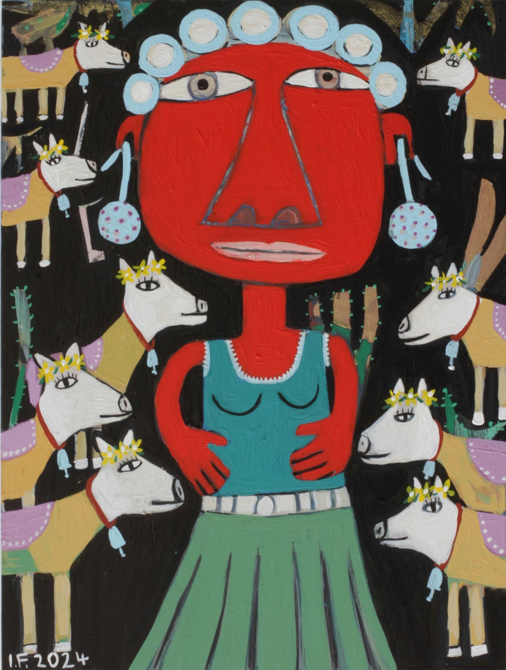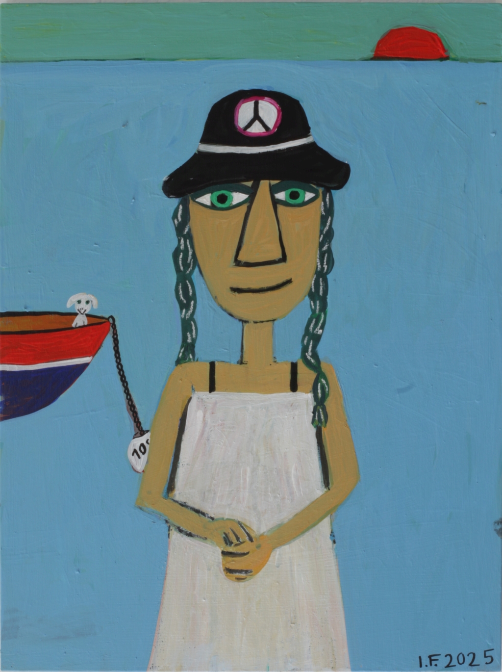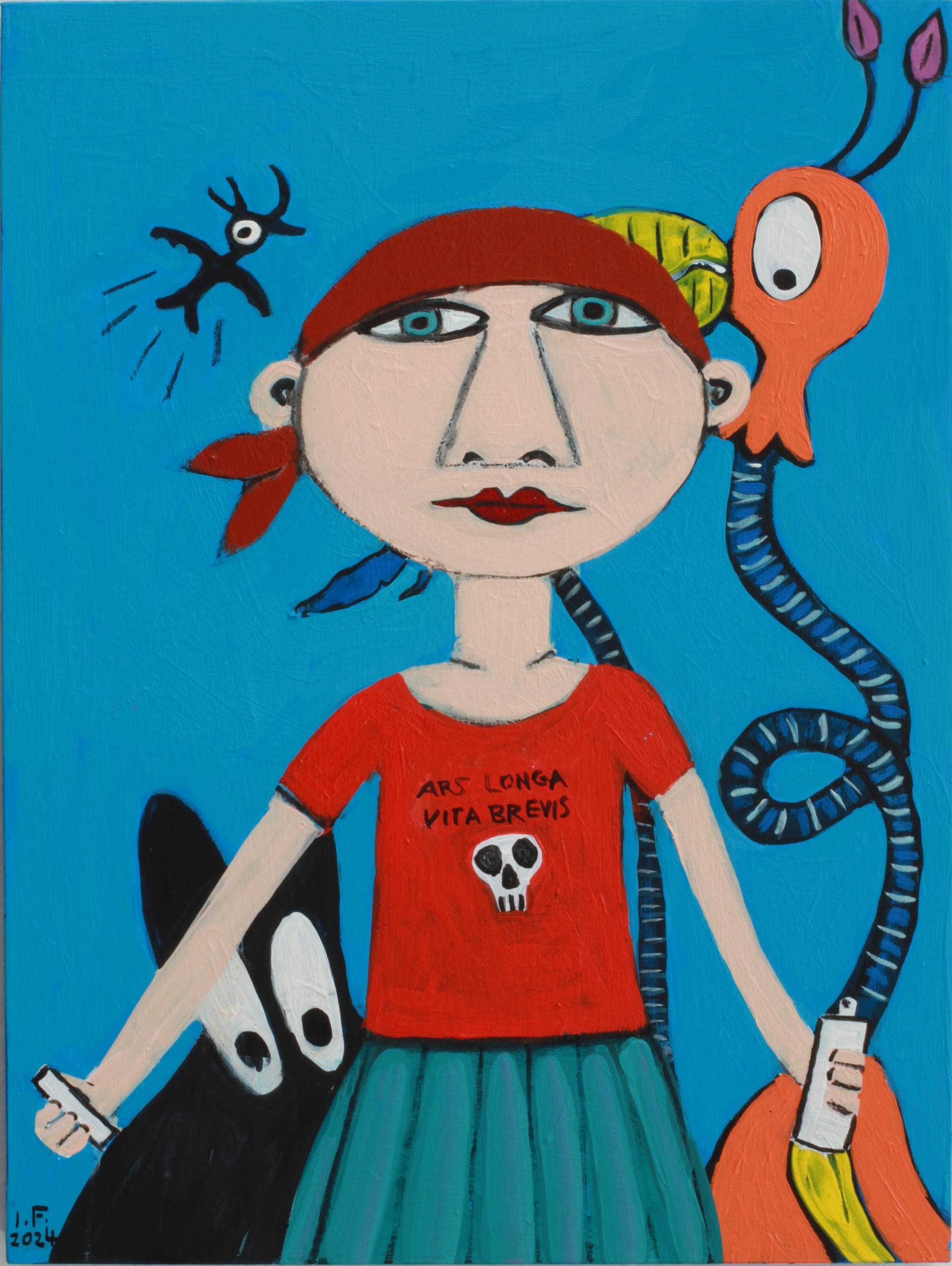 Sie malt vorwiegend Frauen, die uns aus dem Alltag gegriffene oder auf Reisen erlebte Geschichten erzählen.
