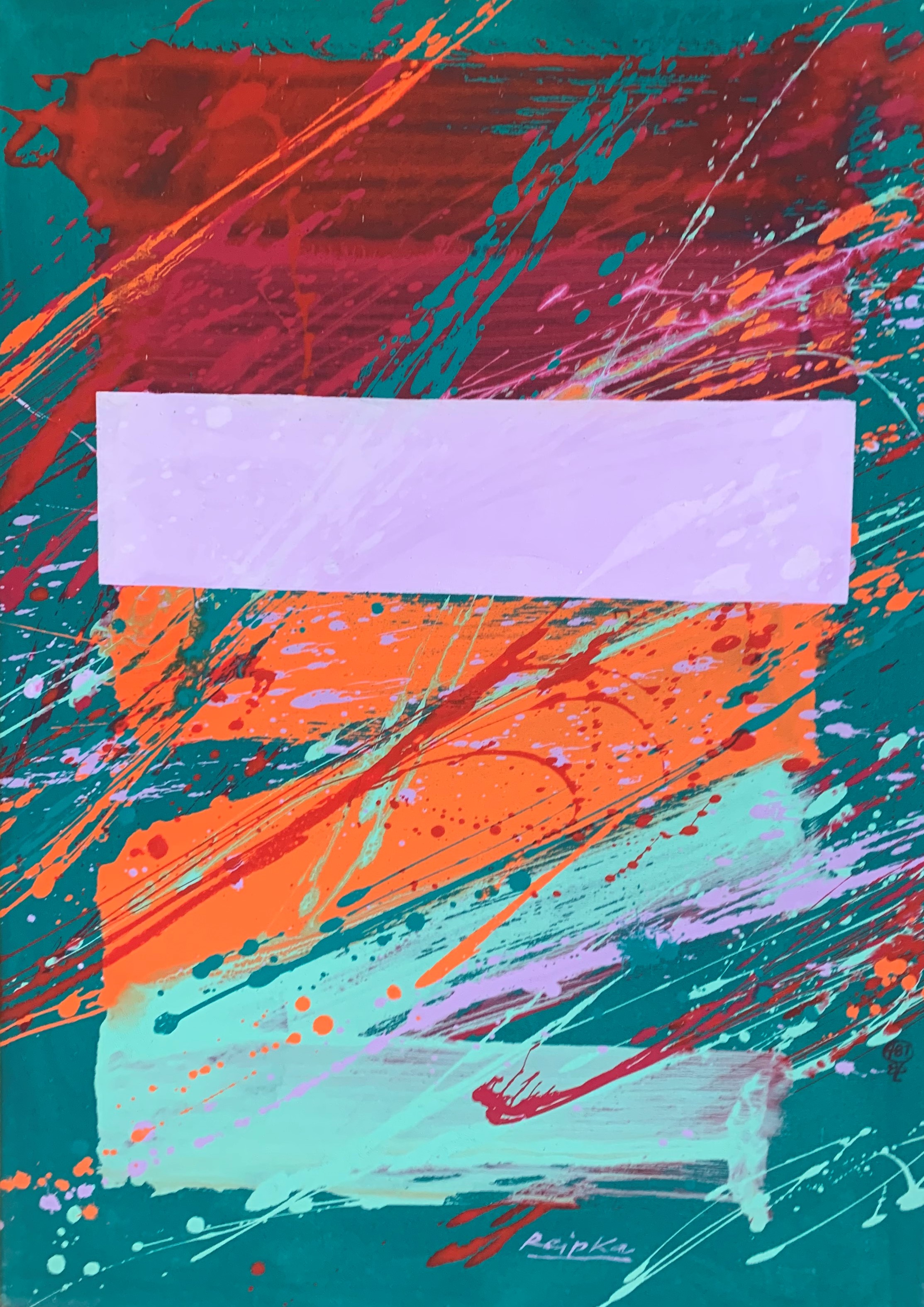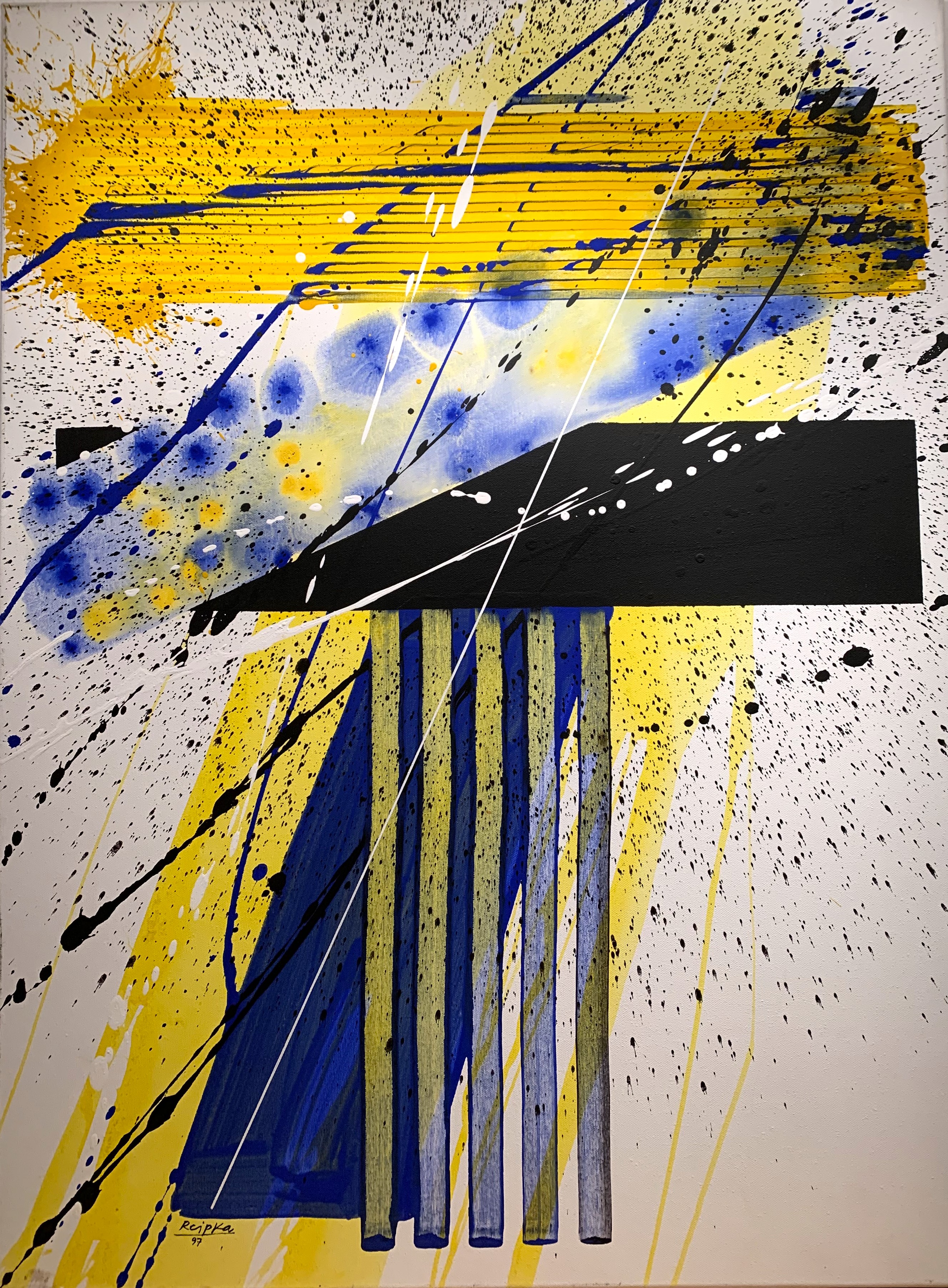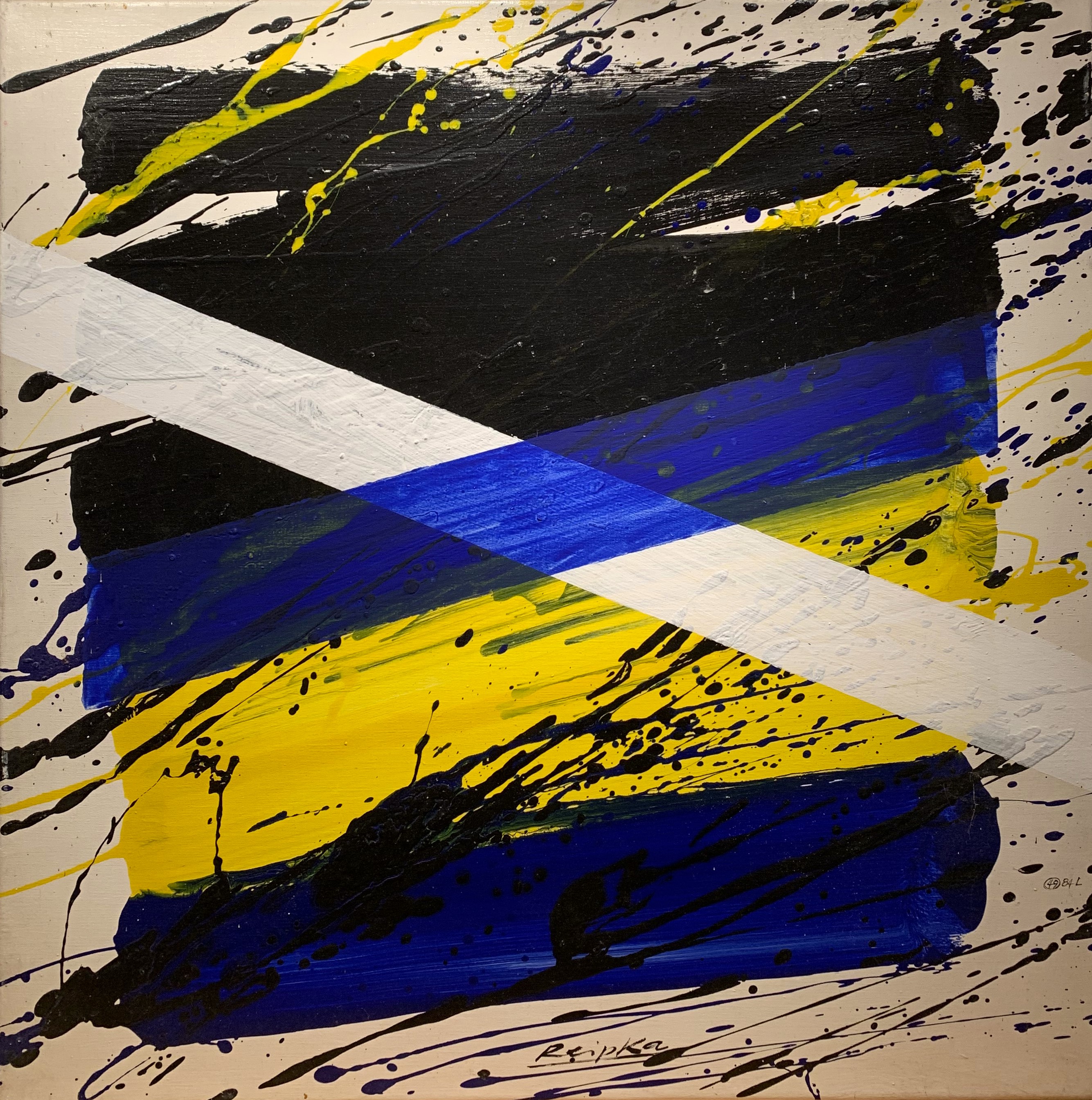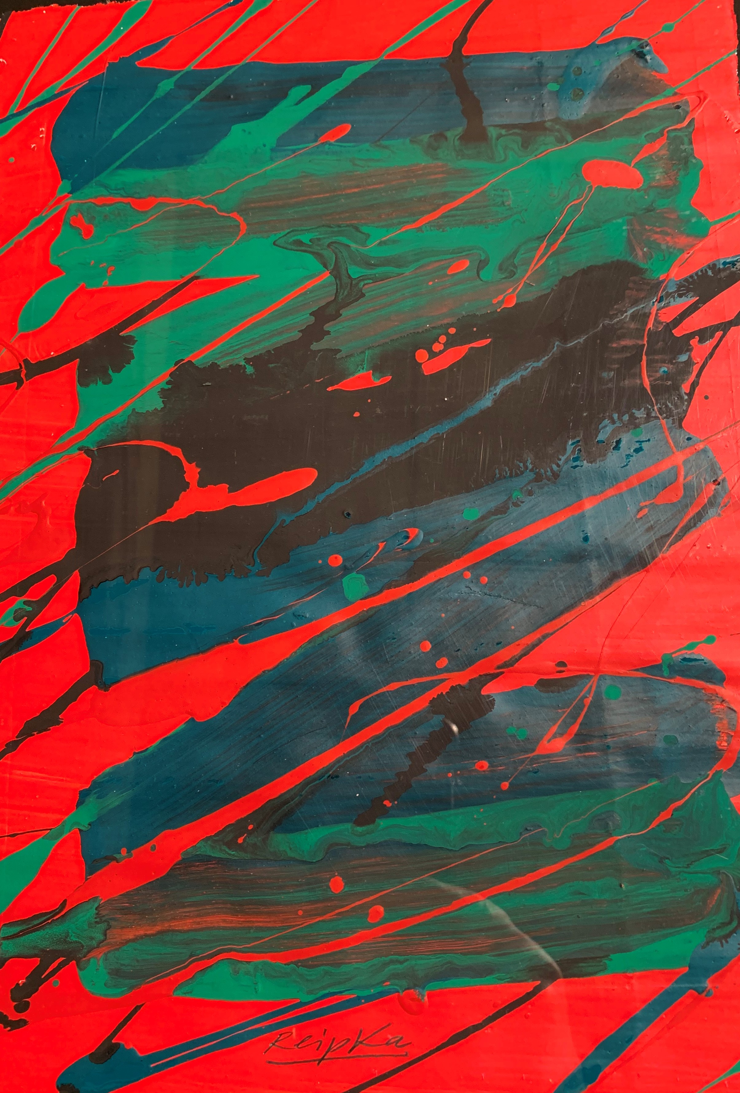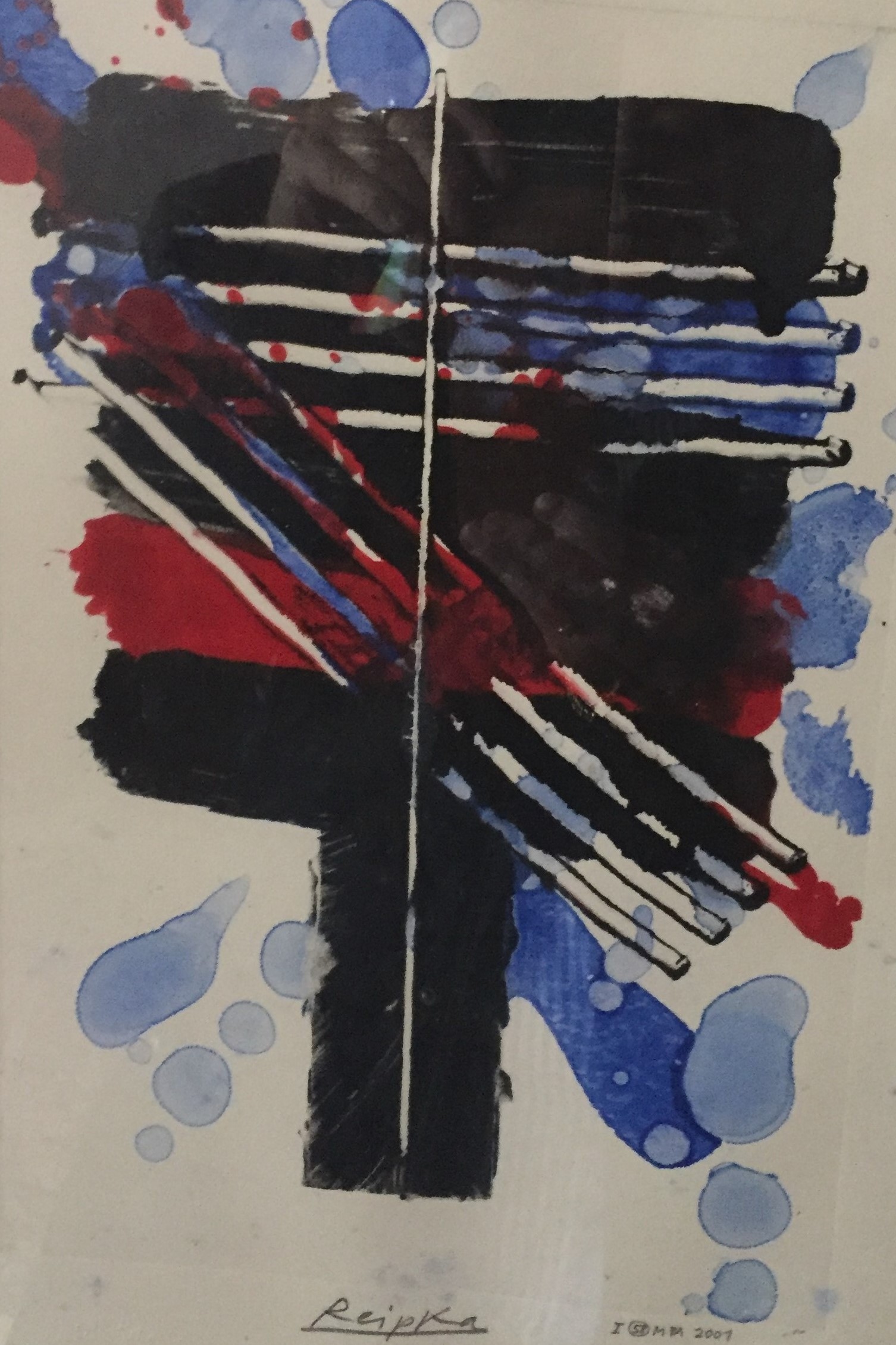 In seiner typischen Manier komponierte Reipka seine Bilder: Zunächst ließ er mit einem in Farbe getränkten Pinsel Tropfspuren in Form von Spritzern, Klecksen und Linien über den Malgrund auf die Vorderseite der Leinwand fallen. Mit Hilfe von kammartigen Schabern schaffte er zusätzliche Strukturen und Transparenzen. Diese Reihungen und Schichten waren, wie er selbst sagte, seine wichtigsten Prinzipien. Seine Bilder, Gouachen oder Glasmalerei leben von dieser Spannung der geometrischen Balken und der farblichen Präsenz.