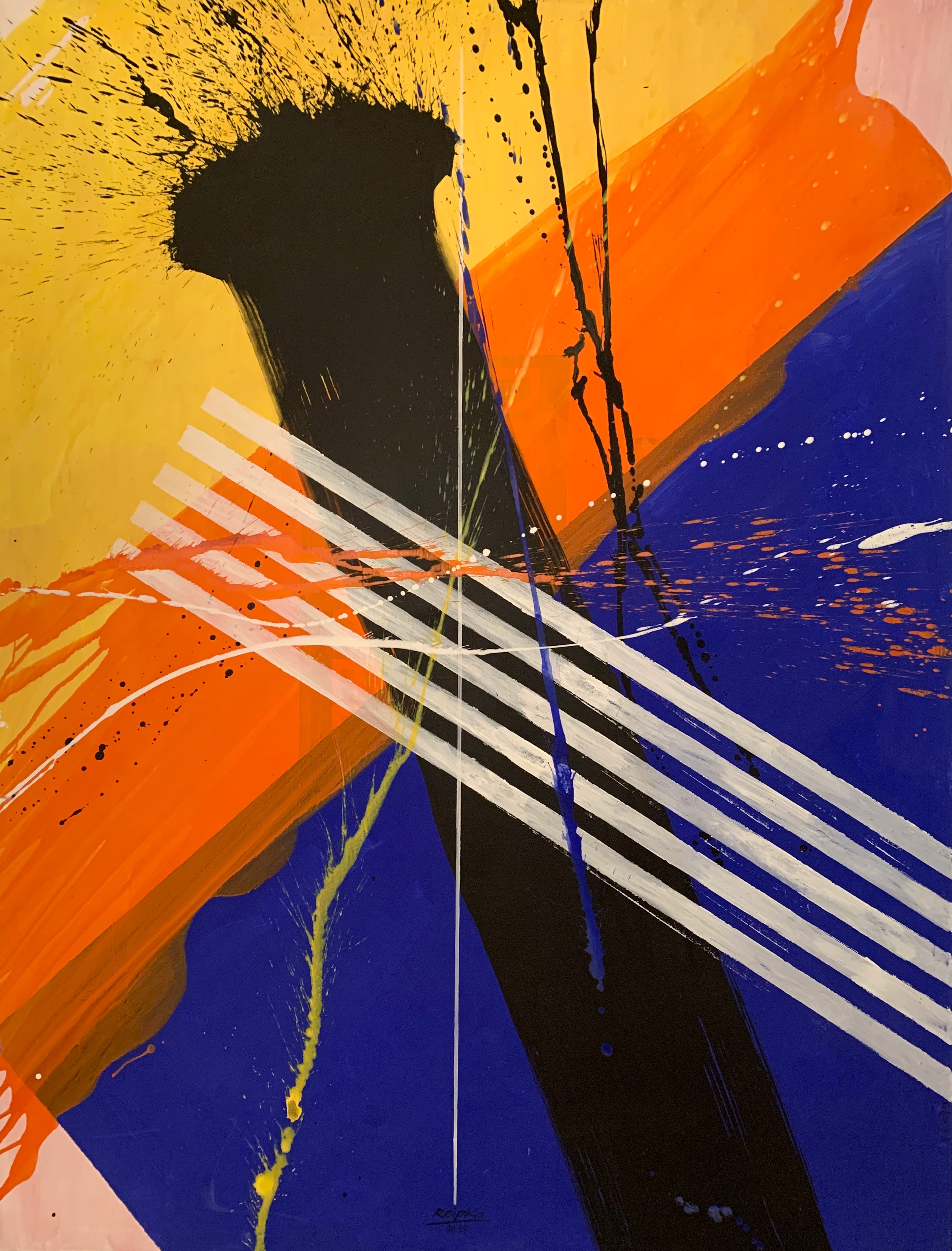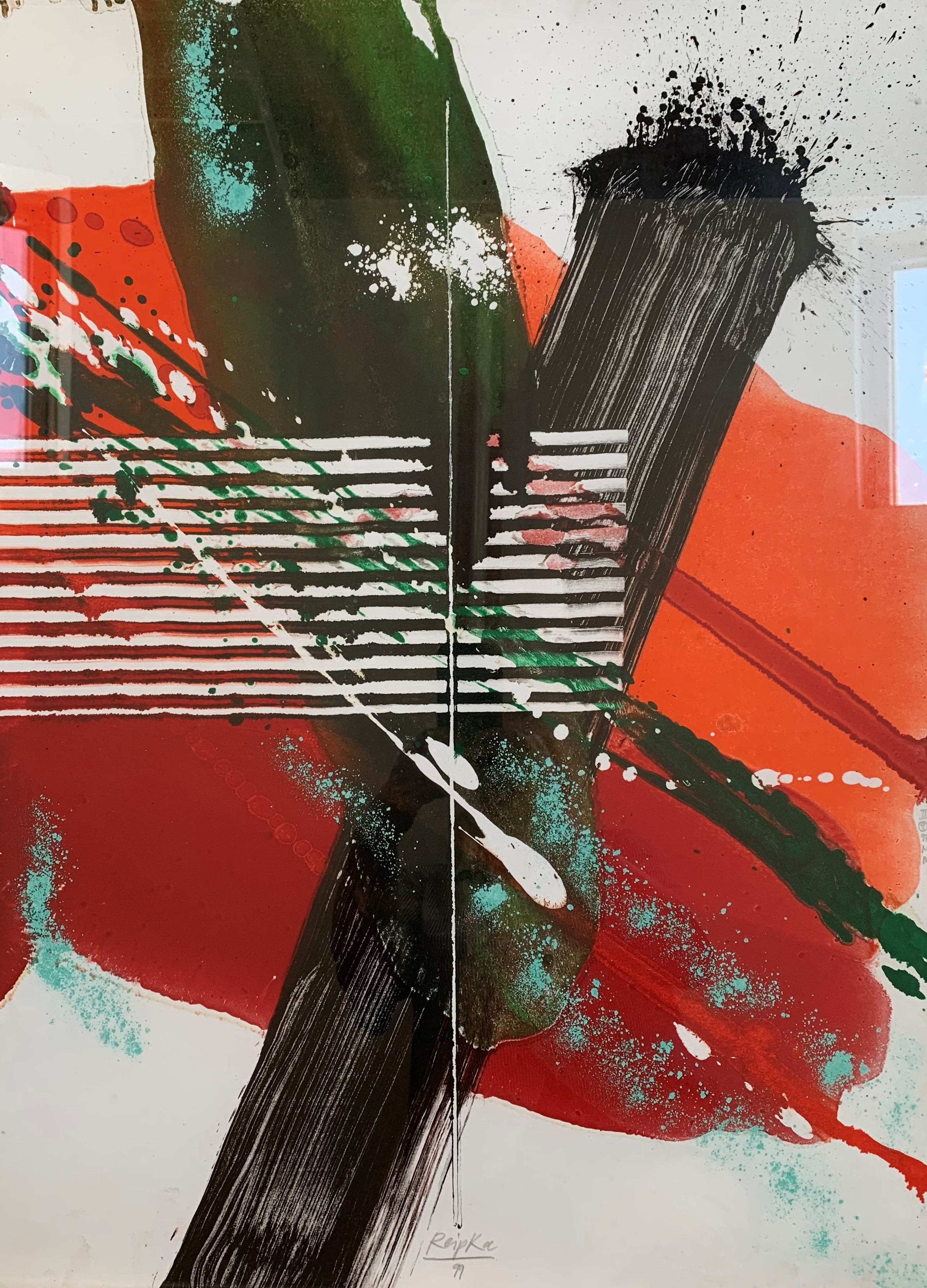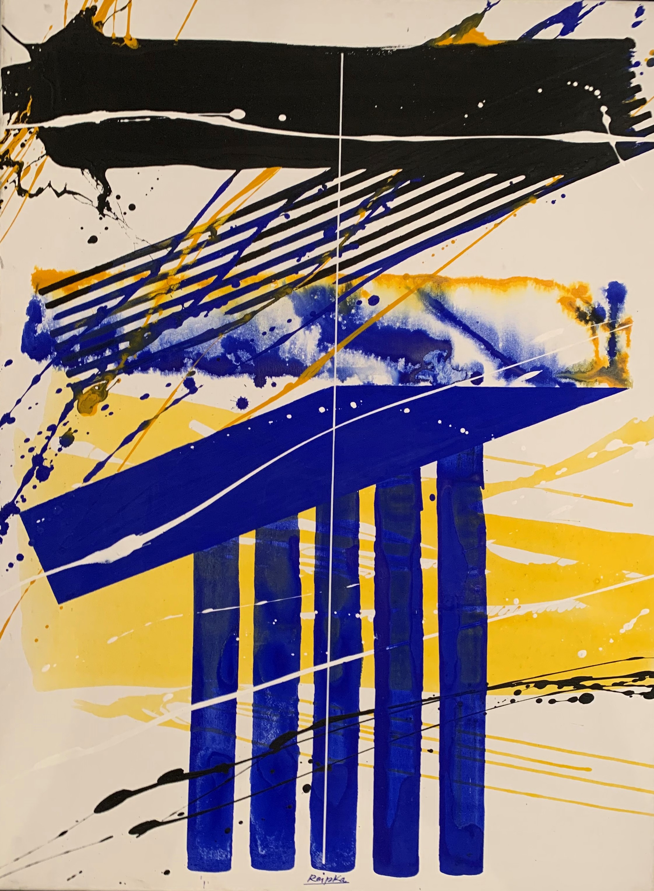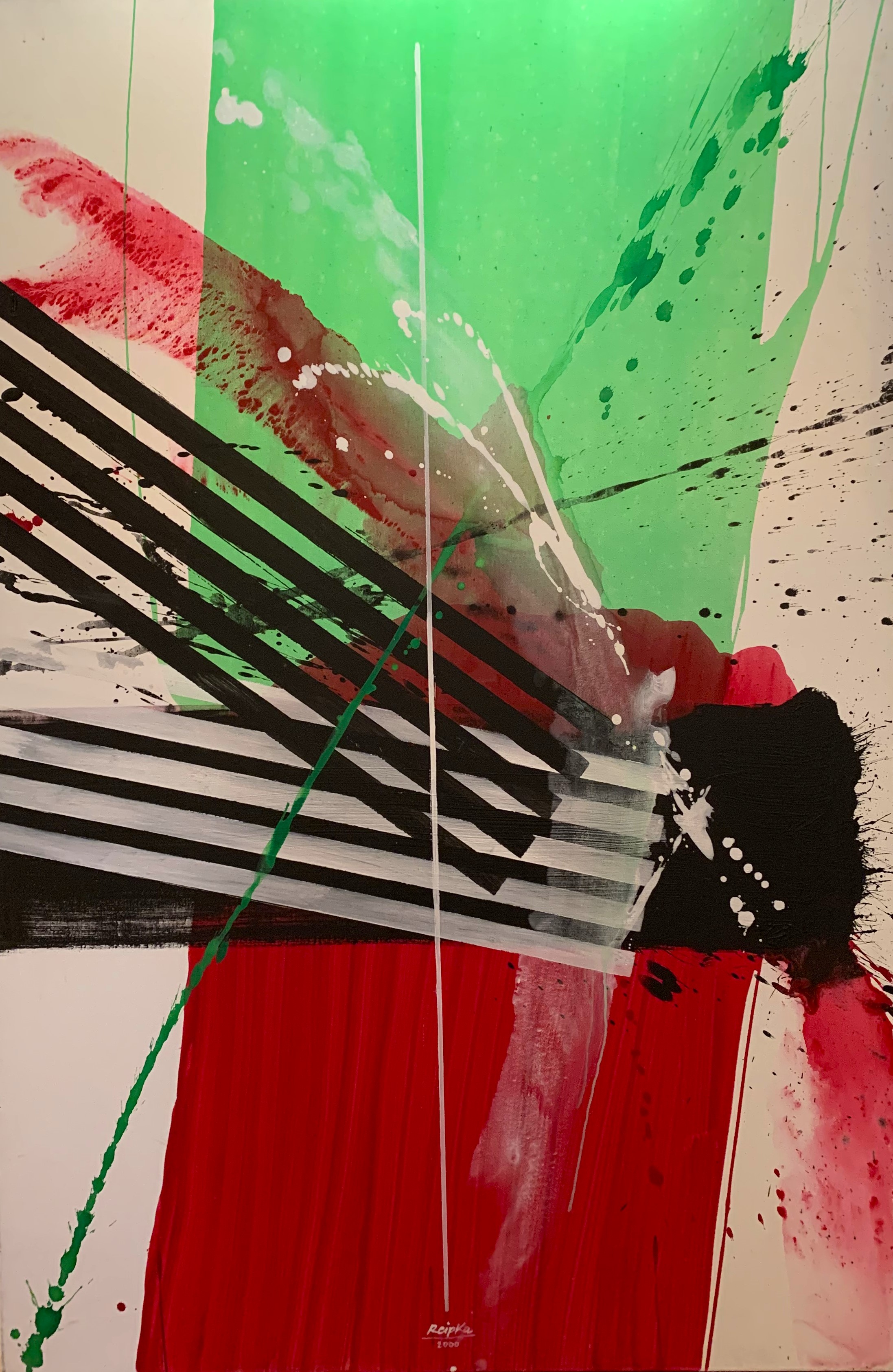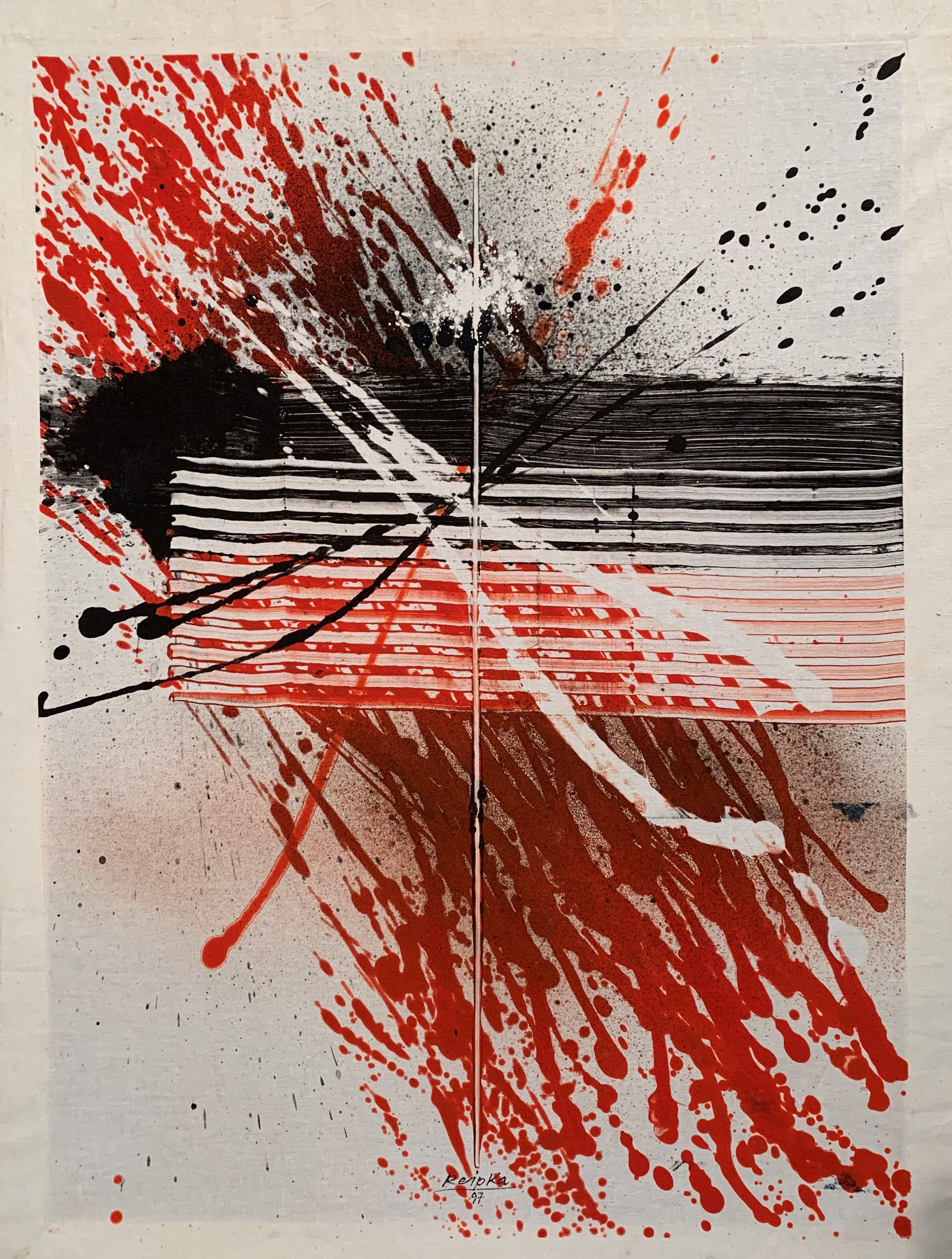 In seiner typischen Manier komponierte Reipka seine Bilder: Zunächst ließ er mit einem in Farbe getränkten Pinsel Tropfspuren in Form von Spritzern, Klecksen und Linien über den Malgrund auf die Vorderseite der Leinwand fallen. Mit Hilfe von kammartigen Schabern schaffte er zusätzliche Strukturen und Transparenzen. Diese Reihungen und Schichten waren, wie er selbst sagte, seine wichtigsten Prinzipien. Seine Bilder, Gouachen oder Glasmalerei leben von dieser Spannung der geometrischen Balken und der farblichen Präsenz.