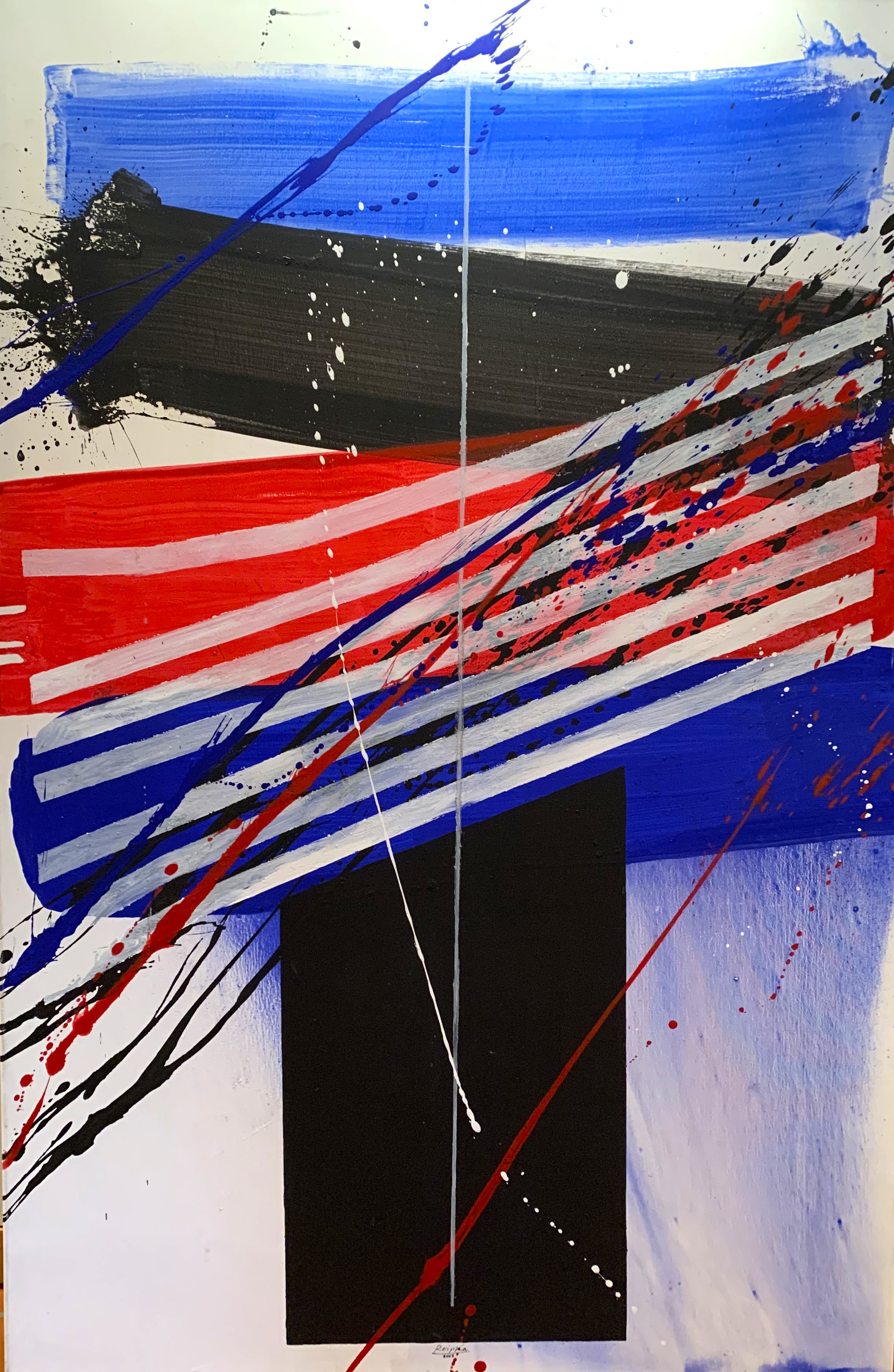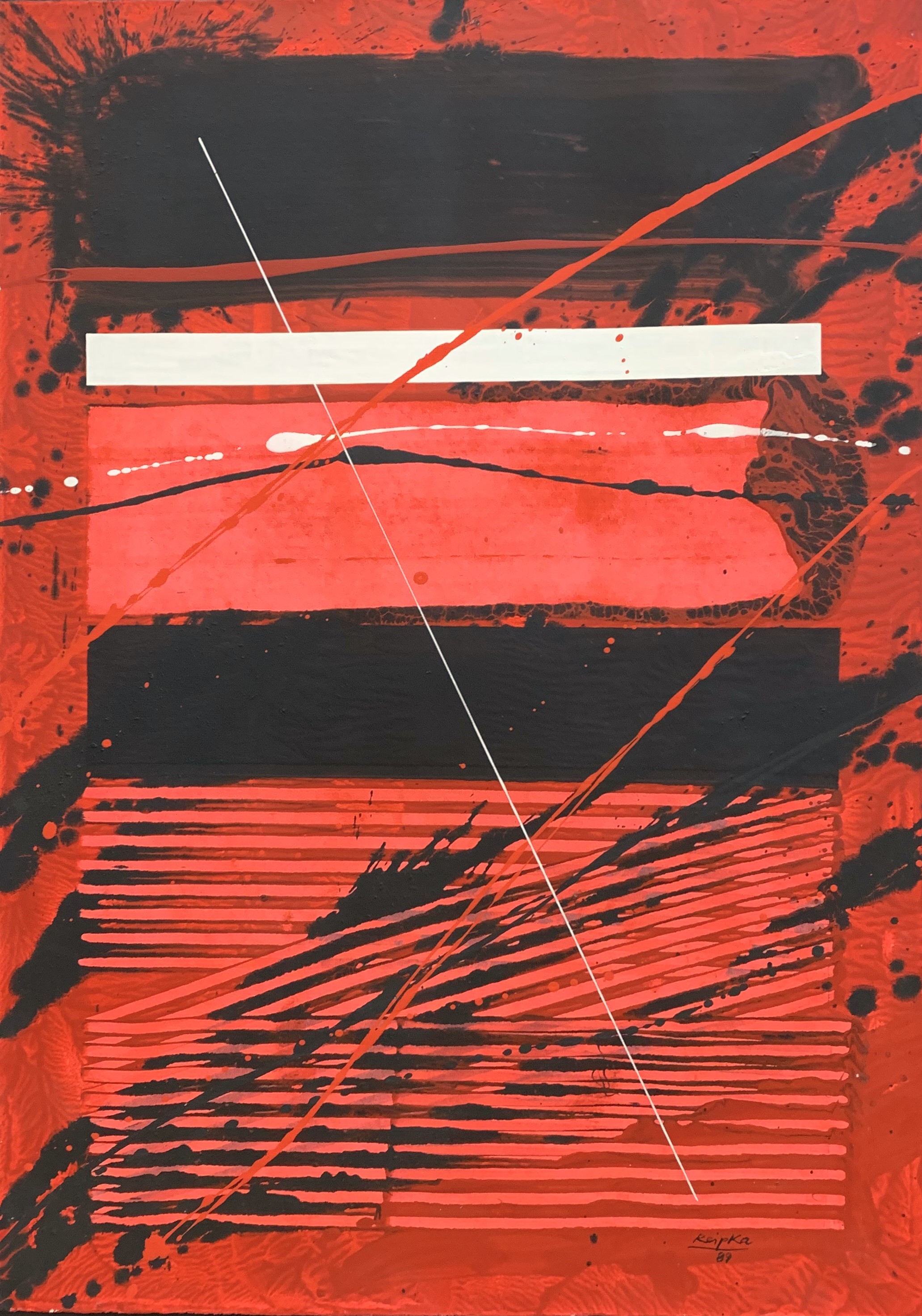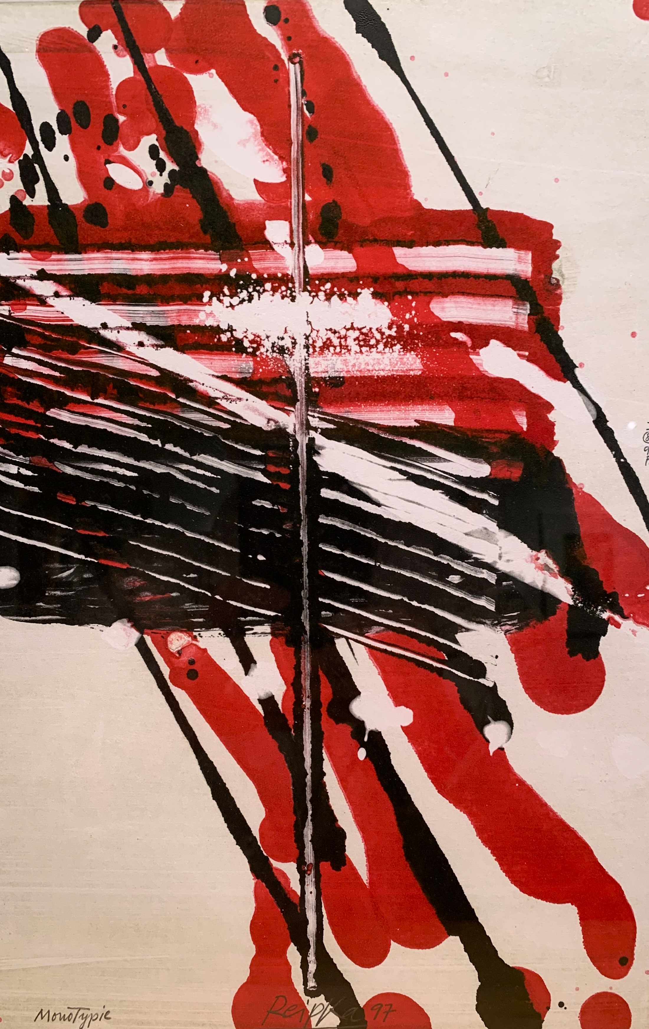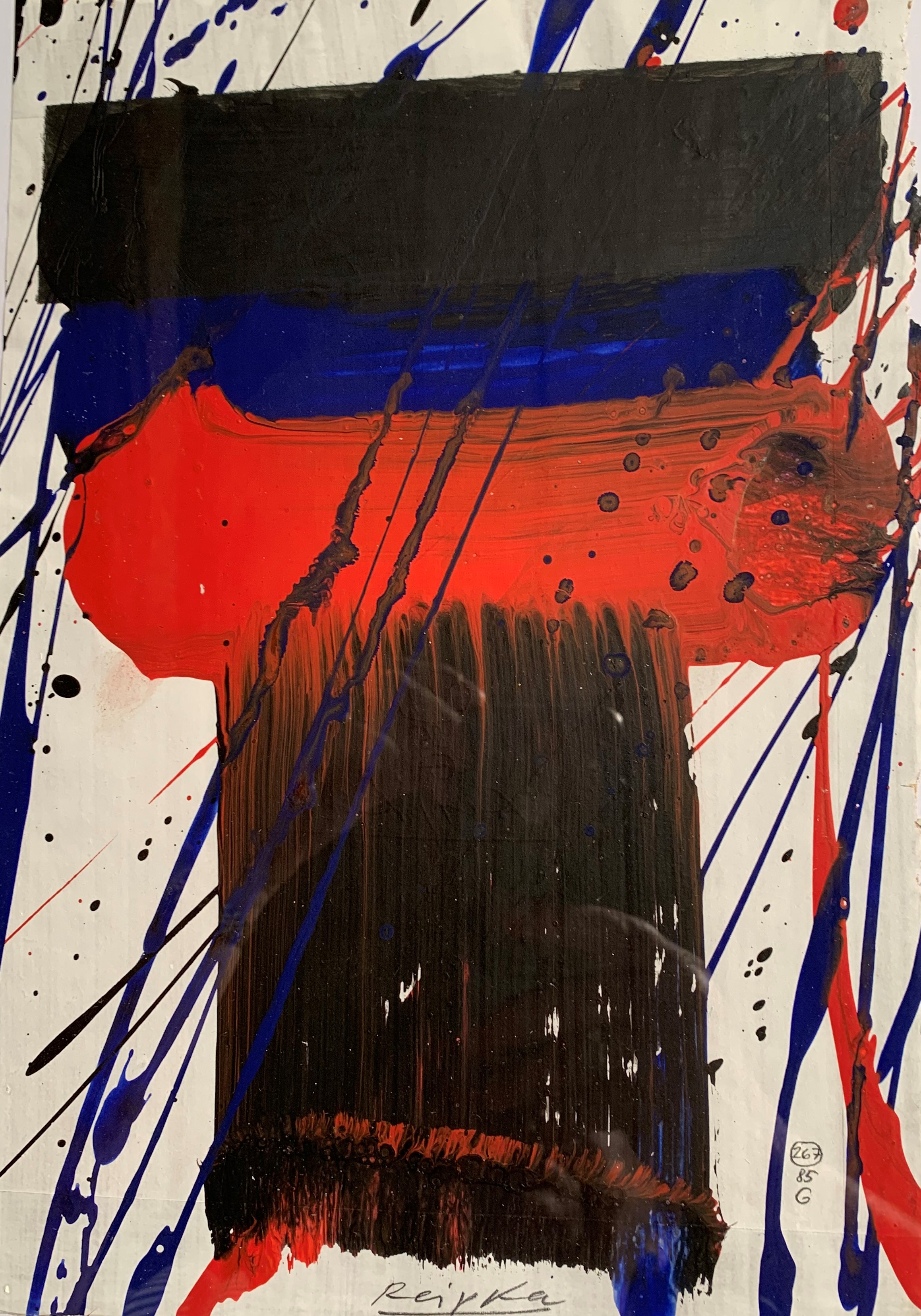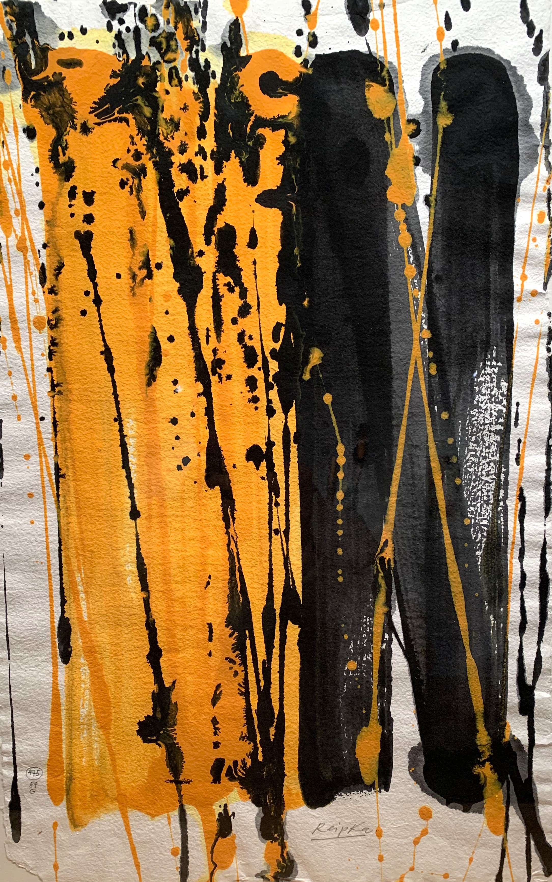 In seiner typischen Manier komponierte Reipka seine Bilder: Zunächst ließ er mit einem in Farbe getränkten Pinsel Tropfspuren in Form von Spritzern, Klecksen und Linien über den Malgrund auf die Vorderseite der Leinwand fallen. Mit Hilfe von kammartigen Schabern schaffte er zusätzliche Strukturen und Transparenzen. Diese Reihungen und Schichten waren, wie er selbst sagte, seine wichtigsten Prinzipien. Seine Bilder, Gouachen oder Glasmalerei leben von dieser Spannung der geometrischen Balken und der farblichen Präsenz.