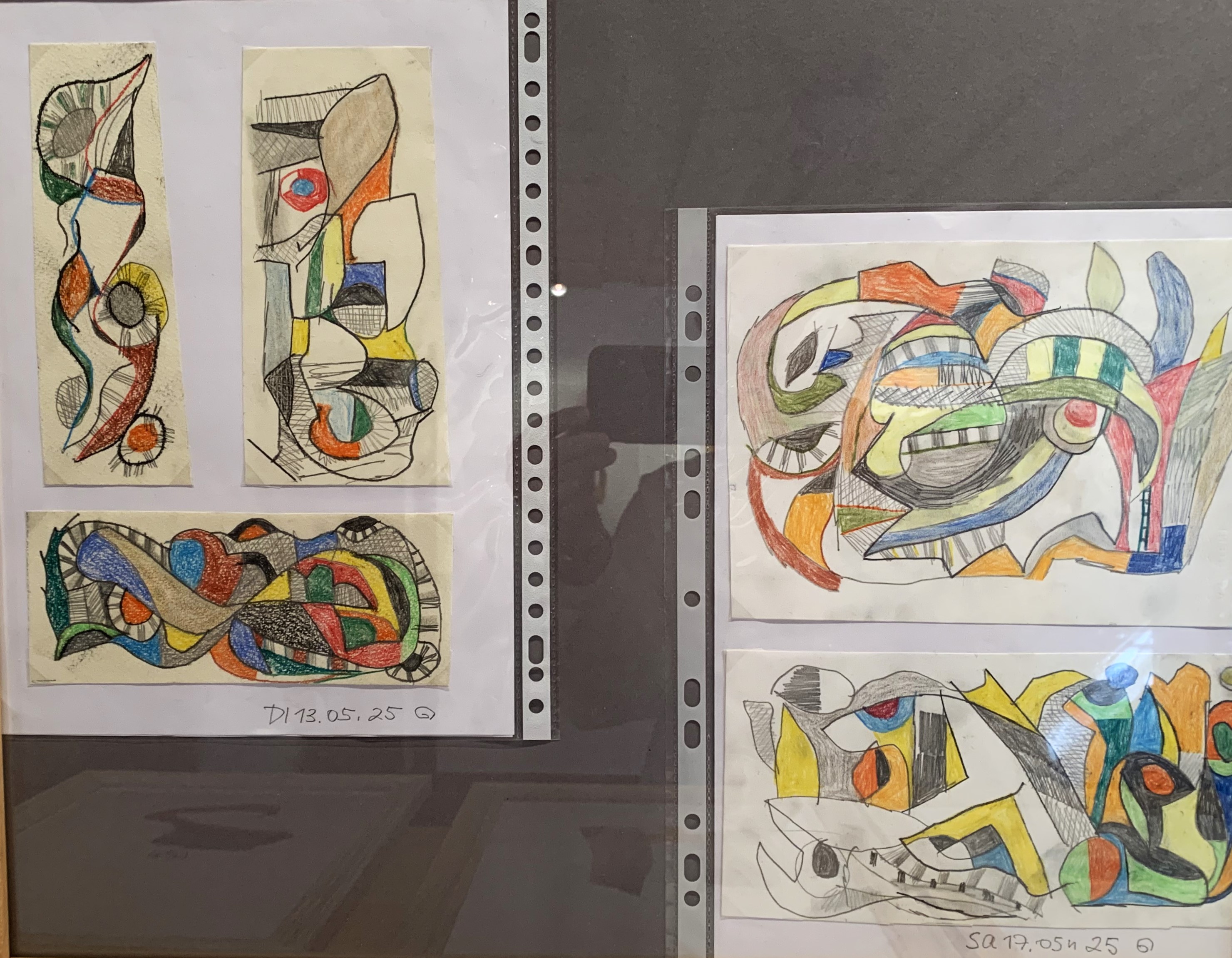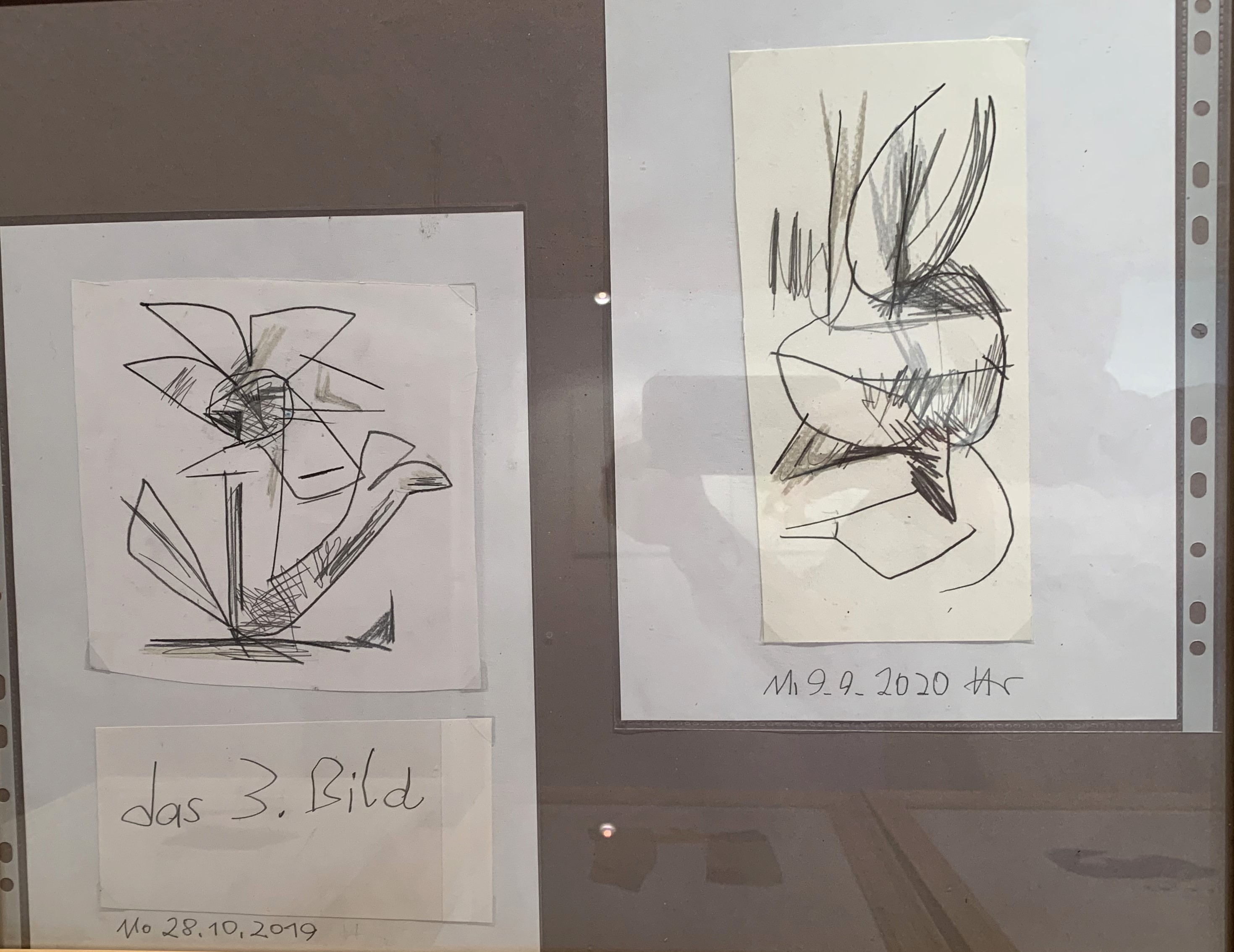 Und alles, was dann zeichnerisch entsteht, quasi beim Abrollen der visualisierten Lebenslinie vom Knäul der Möglichkeiten, und das durch Schieben, Ziehen, Drücken, Gleiten, Führen, Rühren, Rücken beflügelt, bleibt so gesehen beim Haus.