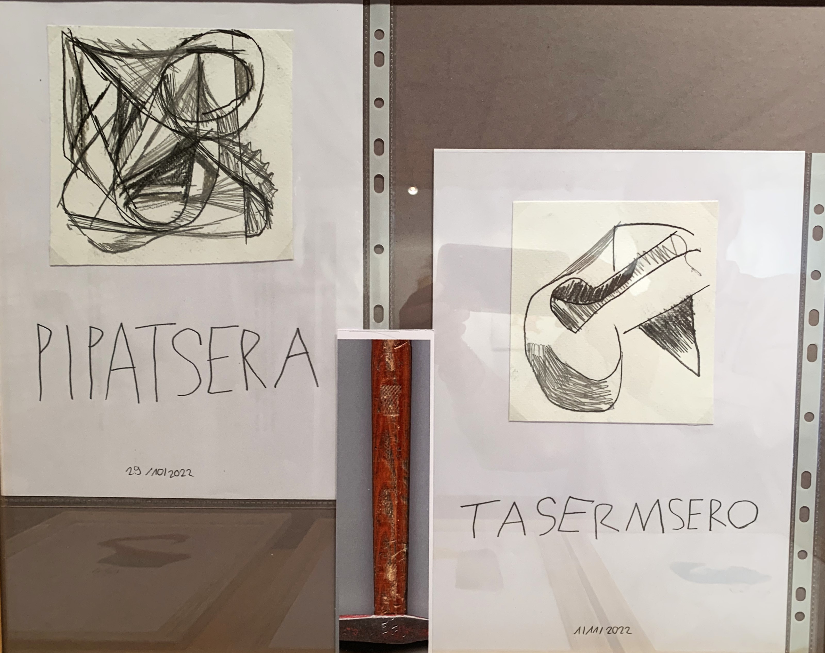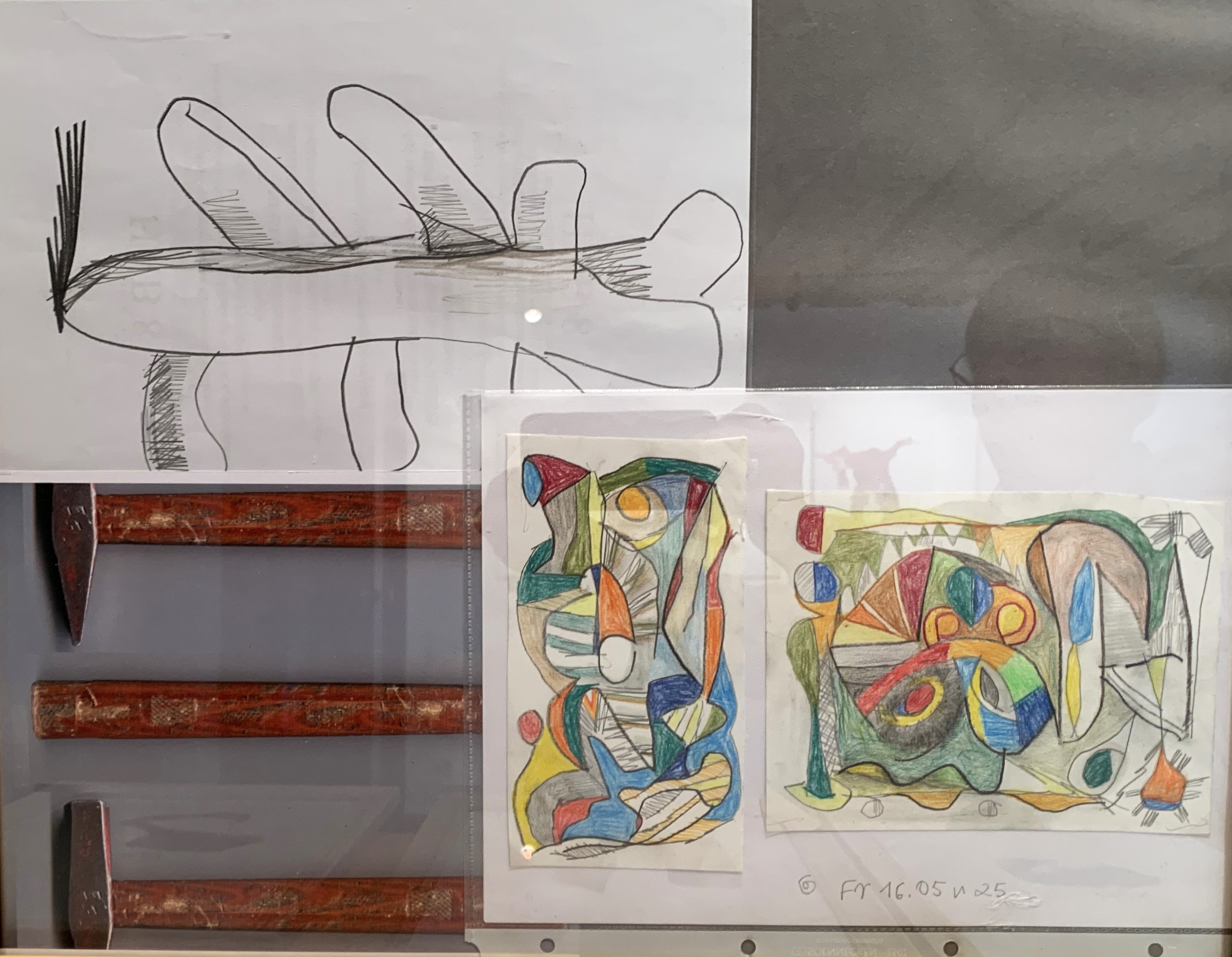 Ich bin Rechtshänder, zeichne aber zweihändig und verwende keine zwei Stifte, sondern auch einen Hammer und den wie eine Schablone mit Stiel, die in fließender Weise in sich die Grundformen Dreieck, Rechteck und Kreis vereint, wenn man ihn mit dem Stift bewegt und umgekehrt.